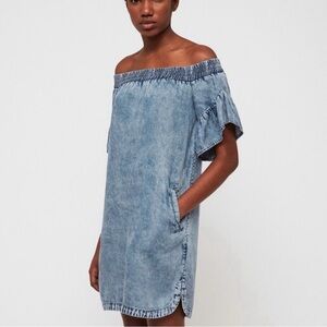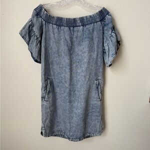 Stylish off-shoulder denim dress. Features ruffled sleeves and a relaxed fit. Perfect for casual outings.