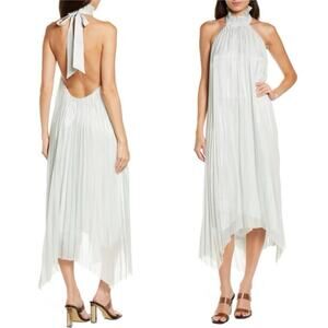 ALLSAINTS Alaya Dress in Mint. Size 2. 100% poly. Made in China. Hand wash. Fully lined. Pull-on styling. Halterneck styling with ruffle detail and tie closure. Pleated chiffon fabric with handkerchief hem. Founded in East London in 1994, AllSaints breaks through the noise to offer something different. Cult leather jackets and signature biker boots - it's what they do. Prints you weren't expecting, and accessories you'll keep coming back for.