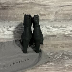AllSaints black suede ankle boots with elasticized lace-up front, peep toe, and chunky 4-inch block heel. Features side zipper closure and rugged tread sole for comfort and edge. Made in Portugal. Size EU 37 (fits like US 6.5–7). Great preowned condition with subtle wear on suede and soles. Includes AllSaints dust bag.