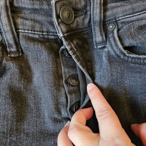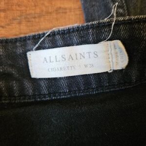 This is a pair of black cigarette skinny jeans by All Saints. The style name is Cigarette Damaged. These jeans have distressed detailing and a hidden button panel on the fly.