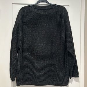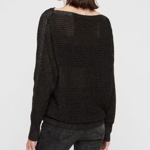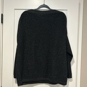 Oversized, open stitch knit, wide boat neck, dolman/batwing sleeves and tapered waist.