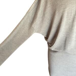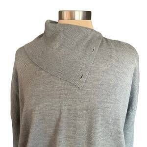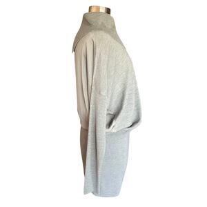 AllSaints Gray Knit Chiffon Flik Dress Sz LARGE Merino Wool Blouson Bodice Fall. Dolman sleeves. Back of bodice is chiffon. The remainder of the dress is merino wool knit. The skirt portion can be adjusted in length, depending on how it is adjusted with the blouson bodice. Convertible neckline can be buttoned and turned down as a turtleneck. Beautiful minimalist piece with versatility in wear.