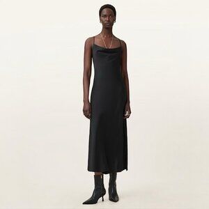 $199 AllSaints Hadley Slim Fit Midi Slip Dress in Black, Size 12