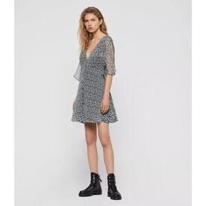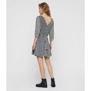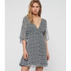 AllSaints Ivey Scatter Dress in Grey. Size 4. Features V-neck, sheer half sleeves with slits, tie waist, dainty floral print, and mini length. Style WD580Q. 100% Polyester. Excellent condition, no flaws.
