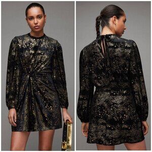 AllSaints Jemima Mini Dress Black Gold Star Velvet Knot Front Holiday Party NWT