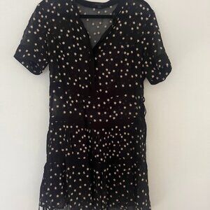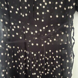 In excellent, pre-owned condition. Does not include a slip, size small, relaxed fit with sheer black with white embroidered stars. Top button-font, tie waist, 100% viscose.