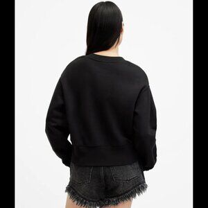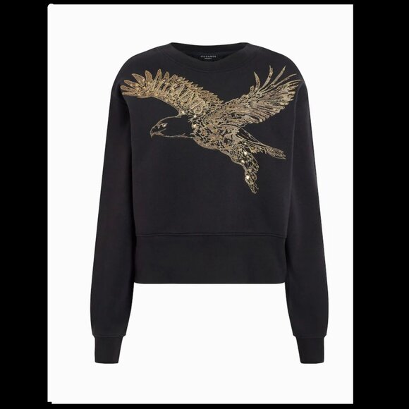The gold embroidery catches the light beautifully, making this sweatshirt perfect for elevated casual looks, streetwear styling, concert nights, or layered under leather jackets for that signature AllSaints vibe.