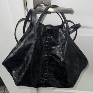 The All Saints Black Leather Over the Shoulder Bag with Mini Interior Bag is a stylish accessory for women. Made from high-quality leather, this rectangular shoulder bag features a zip closure and black leather handles/straps. The solid black exterior color and leather lining give it a sleek and modern look, perfect for any outfit. With its compact size and mini interior bag, this bag is both practical and fashionable, making it a versatile option for everyday use.