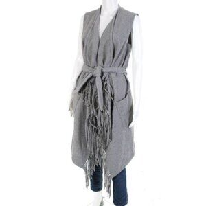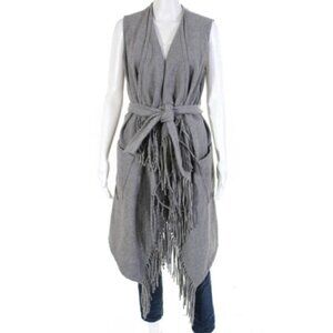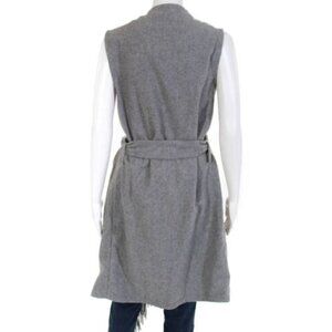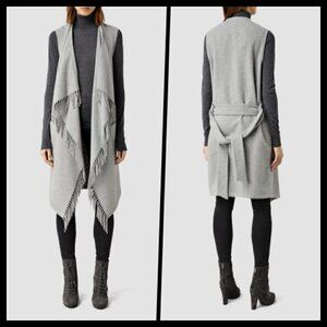 AllSaints Paxon Sleeveless Coat Italian Wool RARE. Crafted from a wool blend (Italian Cloth), sleeveless and unlined for easy layering. Waterfall front with tassel detailing, and waistline belt to close.