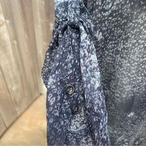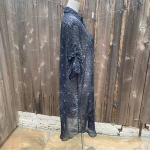 Stylish sheer black button-up tunic. Features rolled sleeves and a classic collar.