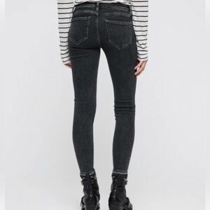 AllSaints super skinny ankle jeans in a washed black / dark gray denim with a raw hem edge. Mid rise and stretchy with a slim, flattering fit. Ankle length works great with boots, sneakers, or heels.