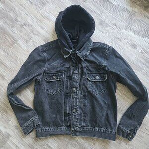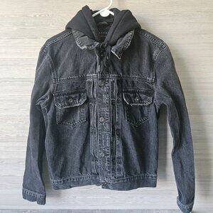 AllSaints Spirit Jean Trucker Jacket Size M Organic Cotton Black Denim Snap Hood