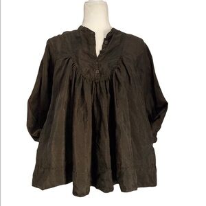 All Saints Smock Top Brown 100% Silk Long Sleeve Blouse featuring a rounded neck, front buttons and Side Pockets. Blouson Loose Fit