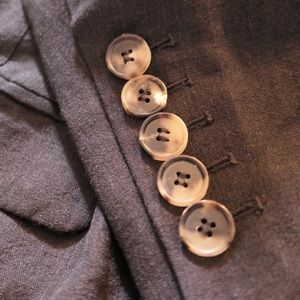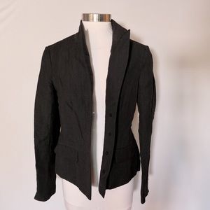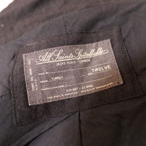 EUC worn only once or twice.  British wool blend, signature AllSaints jacket with special finishings to create a vintage worn texture. The Tammi jacket is military inspired and shrunken down for a flattering shape and features twisted seaming to create a twisted look. 60% Linen 40% Wool.  Dark charcoal black color.