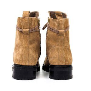 Made from rich tan suede, these ankle boots combine rugged combat style with a refined finish. The lace-up front and side zip closure offer both a customizable fit and easy wear, while the sturdy sole ensures durability and all-day comfort.