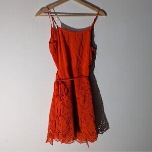 This vibrant red and orange mini dress by All Saints features a playful ruffled and tiered design, perfect for a cocktail night out. The sleeveless sundress is crafted with spaghetti straps, offering a chic and breezy silhouette ideal for warm evenings.