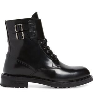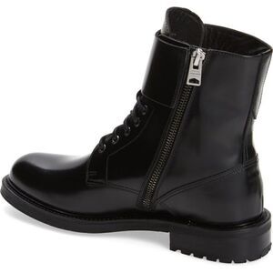 Tiered belts cinch the shaft of a vintage-inspired lace-up boot polished to a shiny finish.