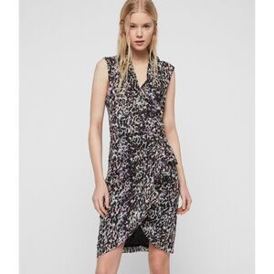 A leopard print dress features split sleeves and a handkerchief hem for effortless style.