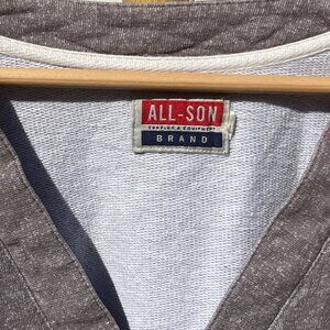 Gray long sleeve V-Neck sweater with pockets by All-Son, featuring a front button-down closure.