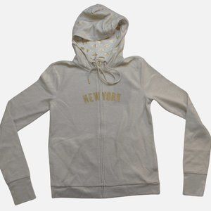 You are sure to have fun when you put on this hoody! We took a twill French terry and printed a gold foil overlay on it to create this unique looking full zip sweatshirt you will want to wear all the time. The thumb holes we adore, side entry pockets, gold zipper, and metal-tipped draw cord all help to make this a sweatshirt that you will wear to more than a game. We lined the hood with a solid coordinating knit and with your favorite team's logo is a foil screen print — so when you have your sweatshirt on and your hood is hanging open on your back you can see your team's logo!