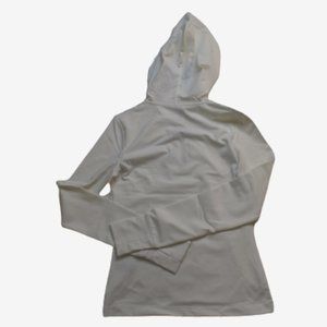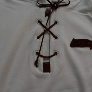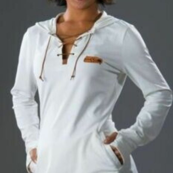Game-on is right! This hooded pullover is going to become every female fan’s “go-to” piece. We used a two-sided peached jersey that takes comfy to a whole new level. The front entry pockets have a hidden zip inside on the left for storing keys, credit card, or anything else you don’t want to lose. The grommets and washed leather lace add a nostalgic feel, while the thumb holes update this classic style. The bottom is open and the hemline will fall below your hips. The featured team logo is a washed leather insignia patch on the upper left chest.