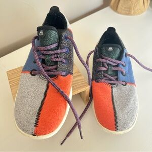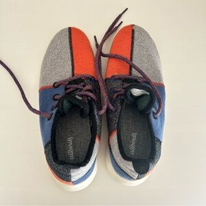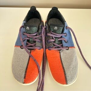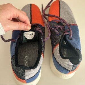 Vibrant Allbirds sneakers for women. Features gray, blue, and orange colors. Designed for comfort and style. Size 10