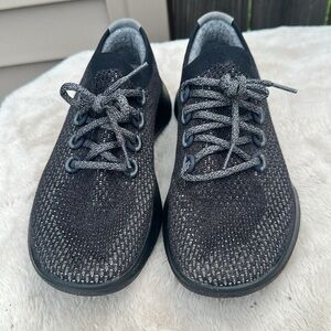 Stylish Allbirds sneakers. Black and gray knit design. Comfortable and versatile.