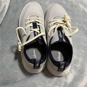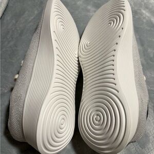 Light gray knit sneakers with cream laces. Allbirds comfort and style.