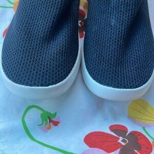 I think these are navy, looking at the website they don’t look dark enough for black. Good condition some lighter spots on the top of the left shoe would probably come out in the wash not very noticeable though. In excellent condition otherwise. Made of recycled materials. Women’s 8.