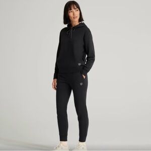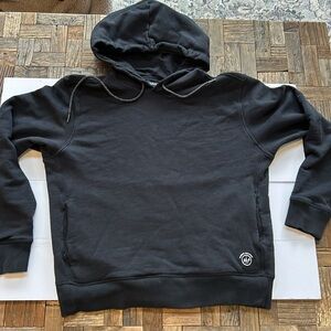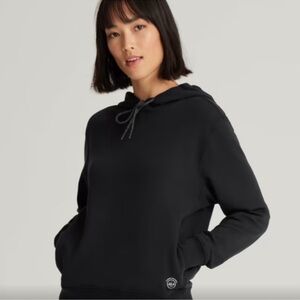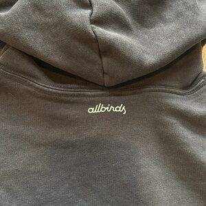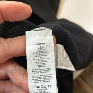 Allbirds Women’s The R&R Hoodie Natural Black. 50% organic Peruvian Pima cotton, 30% hemp, 20% tencel Lyocell. 2 front hand pockets. Roomy hood with drawcord. Size Medium