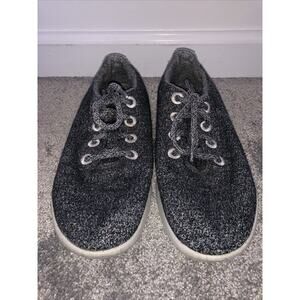 Allbirds wool runners in heathered gray. Features a round toe and matching gray cord laces. Lace holes are embroidered in white. Both the tongue of the shoe and the back of the heel have small white tabs with the logo for easy pull-on. The sole is white, with a decorative brand label on the heel. Lightly padded inner sole, light tread on lower outer sole. Women’s size 7. EUC, minimal wear only.
