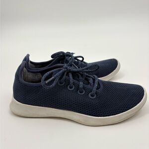 Stylish navy blue knit sneakers with a sleek design. Perfect for casual wear.