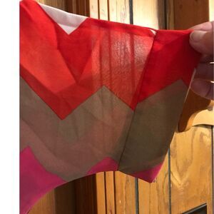 Allegra K Blouse Women's Medium Sheer Tan Red White Pink Black Zig Zag Print. This flowy sheer geometric zig zag colorblock print blouse features a round neck and mid-length banded short sleeves. It is in very good pre-loved condition with no holes, stains, snags or flaws. Please feel free to ask questions.