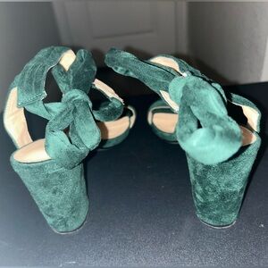 Stylish open toe design. Ankle tie back. Comfortable chunky heel. Velvet material