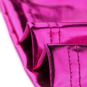 Shiny pink mini dress. Sleeveless design. Flared skirt. Perfect for parties.