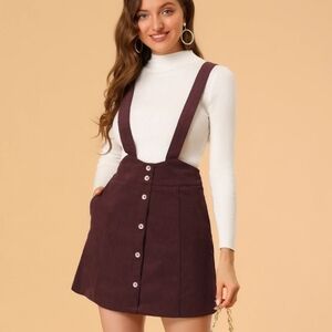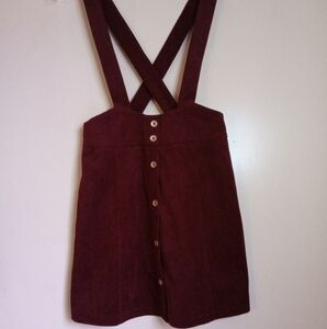 Deco Vintage suspender mini skirt in wine. NWT. Features back zip, high waist, button decor, 2 pockets, adjustable straps, A-line skirt, machine washable. Preppy, Fall, Academia waist 29.13" skirt 17.5" straps 33.5" All measurements are approximate and taken with the article laying flat and unstretched Thank you for stopping by and have a fabulous day 🤩! 95