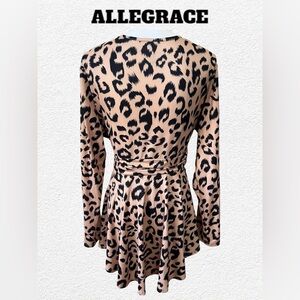 👉🏻 Allegrace women's blouse, specifically an animal print V-neck tunic. It features long sleeves and a wrap-style front that accentuates the waist before flowing into a flared hem.
