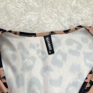 👉🏻 Allegrace women's blouse, specifically an animal print V-neck tunic. It features long sleeves and a wrap-style front that accentuates the waist before flowing into a flared hem.