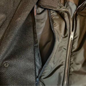 Features: Made in Italy, dark brown and black heather cashmere blend, zip in vest with a sweater collar, two front slotted pocket and one zip pocket at front, spare buttons included