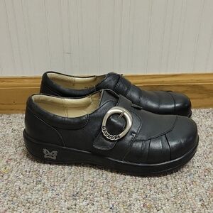 Allegria, woman Black Leather Khloe Slip-On Shoes with Buckle Sz 38. (US 7.5-8)