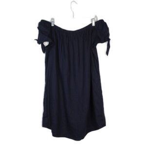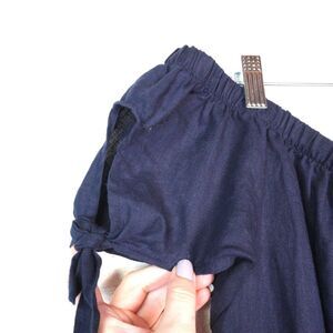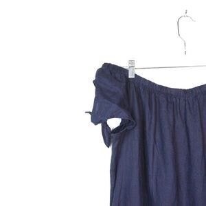 This is a 100% linen dress from Allen Allen. Navy blue color, off the shoulder with a tie accent on edge of arm. Size L, pullover style, excellent pre-loved condition, there are a couple pills here and there - as shown in last photo, very typical of 100% linen.