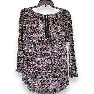 Its loose knit provides comfort and its high low hem and faux back zipper gives it an edgy, fashionable flare.