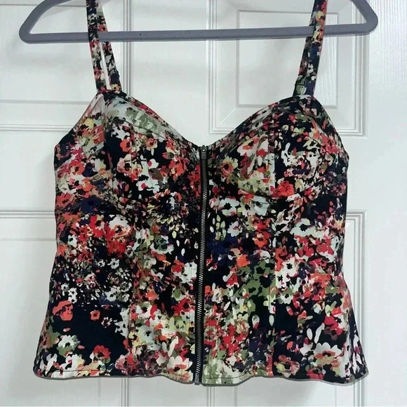 floral bustier, corset top, zip front top, structured bodice, fitted floral top, coquette aesthetic top, dark romantic style, feminine floral print, night-out top, Y2K revival, party top, spring floral print, adjustable strap top, Allen B by Allen Schwartz