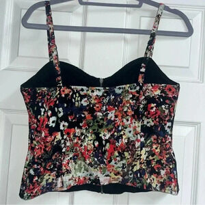 Allen B by Allen Schwartz floral bustier corset top with a dark romantic multicolor print, structured cups, zip-front closure, and fitted silhouette. Feminine coquette and soft-girl aesthetics blend with artsy floralcore and Y2K revival details. Features adjustable straps, sculpted bodice, and vibrant painterly florals on a black base. Modern statement piece with indie, cottagecore, and romantic style appeal.