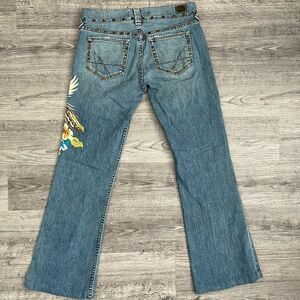 Elevate your wardrobe with these vintage Allen Schwartz women's jeans. The jeans are adorned with a beautiful floral pattern that features studded accents, making them a perfect addition to your collection. The jeans are made of a blend of polyester and spandex, which provides a comfortable fit with stretch features. The mid-rise jeans have flared style that goes well with any outfit. The jeans are perfect for any occasion, whether it's a casual day out or a night out. The jeans come in a size 29 and are suitable for regular size types. Add these jeans to your wardrobe and make a statement with their unique design.