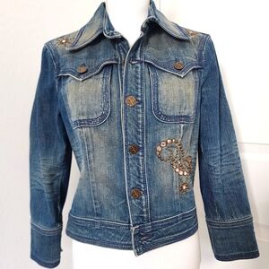 Brass studs and Cream colored Rhinestones. Very classy look on the denim.