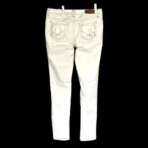 Stretchy White Distressed Skinny Jeans with Burnt Orange Stitching