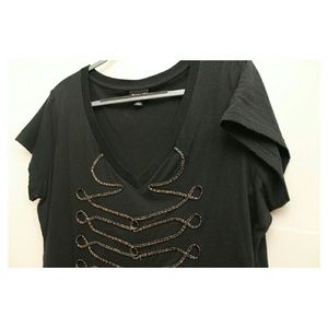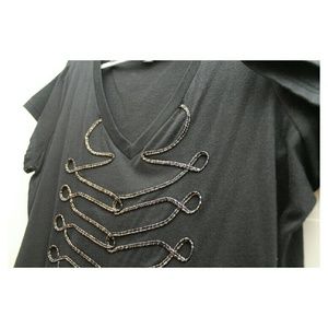 Short sleeve v-neck. Black. Gold embroidery on front. Allen B by Allen Schwartz. Tag still on.