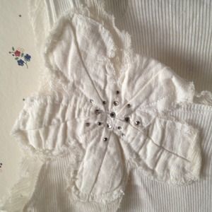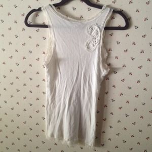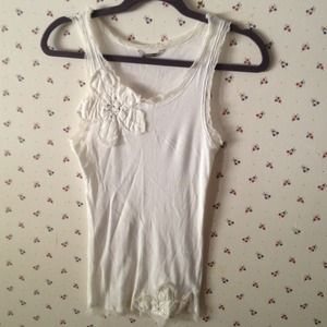 Whie ribbed tank with gauze neck, arm and hem trim and linen rhinestone flowers. Like new.