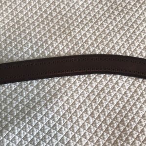 Dark brown leather. A few scuffs, as shown in pictures. Size tag removed, but it is a size 40. Approx. 46” long leather (without buckle), with first hole at 38” and last hole at 42”.